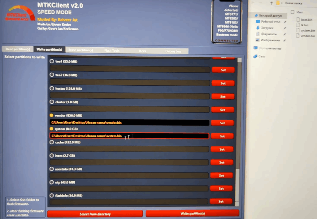 - Выбираем 4 файла из 0023 прошивки (System -> system.bin, Vendor -> vendor.bin, Boot -> boot.bin, LK -> lk.bin), нажимаем Write partition(s) и ждём окончания загрузки