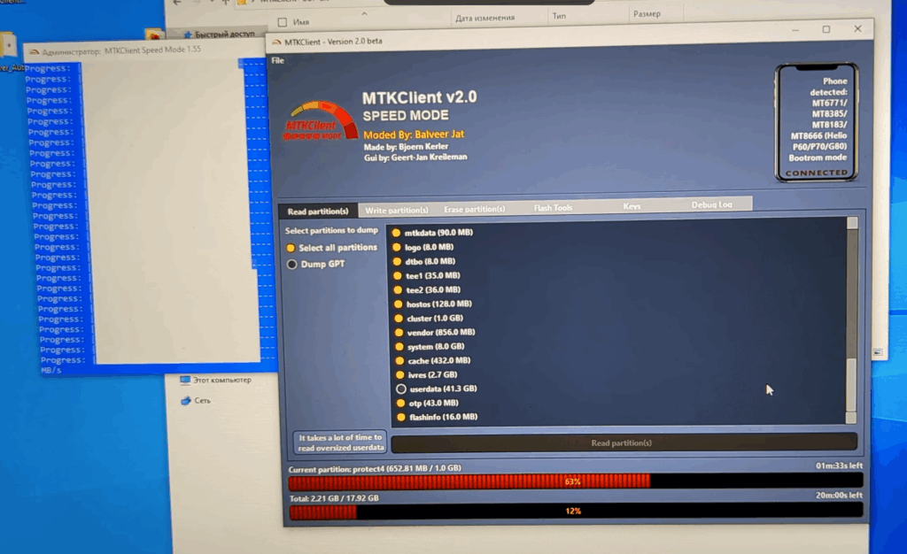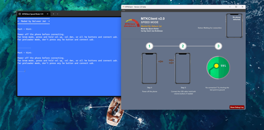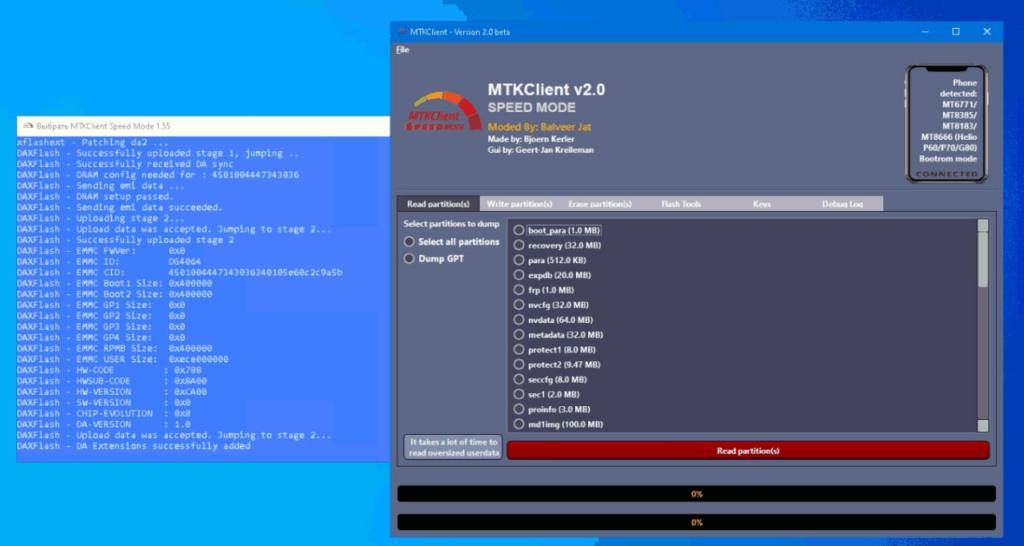 Открываем MTKClient_GUI 2.0.exe. Делаем так, чтобы на экране было видно и голубую консоль и сам MTKClient. Включаем звук для удобства определения, что блок подключился.