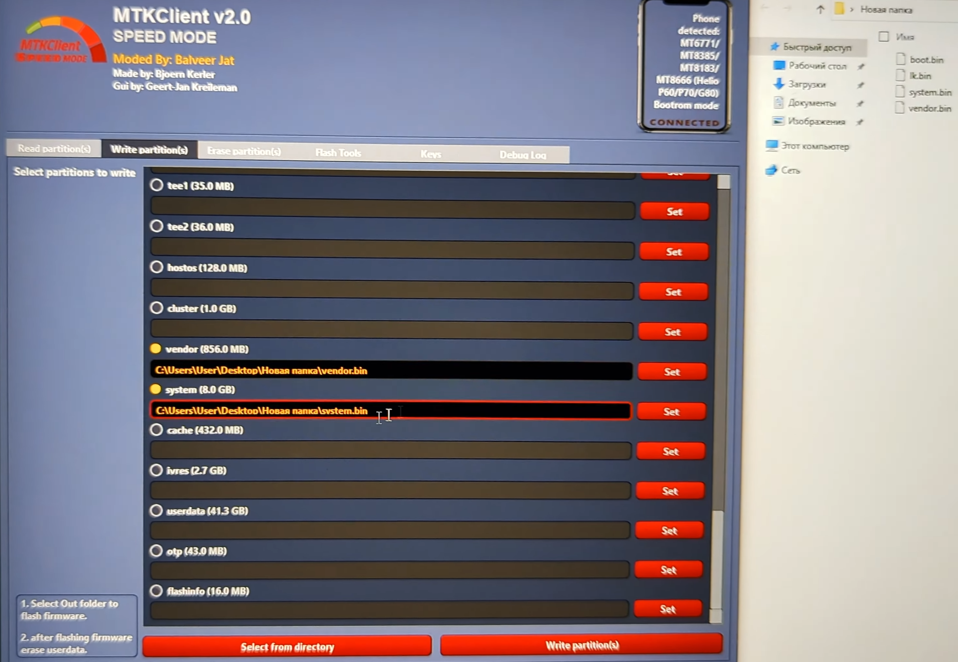 - Выбираем 4 файла из 0023 прошивки (System -> system.bin, Vendor -> vendor.bin, Boot -> boot.bin, LK -> lk.bin), нажимаем Write partition(s) и ждём окончания загрузки
